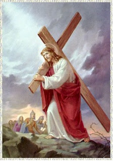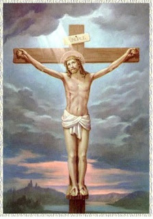 "Ele próprio carregava a sua cruz para fora da cidade, em direção ao lugar chamado Calvário, em hebraico Gólgota. Ali o crucifícaram, em com ele outros dois, um de cada lado, e Jesus no meio... ...Junto á cruz de Jesus estavam de pé sua mãe, a irmã de sua mãe, Maria, mulher de Cléofas, e Maria Madalena. Quando Jesus viu sua mãe e perto dela o discípulo que amava, disse à sua mãe: 'Mulher; eis aí teu filho.' Depois disse ao discípulo: 'Eis aí tua Mãe'. E dessa hora em diante o discípulo a levou para a sua casa. Em seguida, sabendo Jesus que tudo estava consumado, para se cumprir plenamente a Escritura, disse: 'Tenho sede'. Havia ali um vaso cheio de vinagre. Os soldados encheram de vinagre uma esponja e, fixando-a numa vara de hissopo, chegaram-lhe à boca. Havendo Jesus tomado o vinagre, disse: 'Tudo está consumado.' Inclinou a cabeça e rendeu o espírito. '' (Jo 19, 17-30)